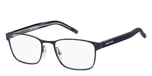 Celebrate American college wear with these Tommy Hilfiger men's eyeglasses. Inspired by the preppy look, these frames feature heritage details like 'Est. 1985' lettering, a red, white, and blue ribbon on the end tip, and an elegant rectangular rivet. The multi-layer acetate temples showcase the sophisticated Polo Pique pattern of the metal core.