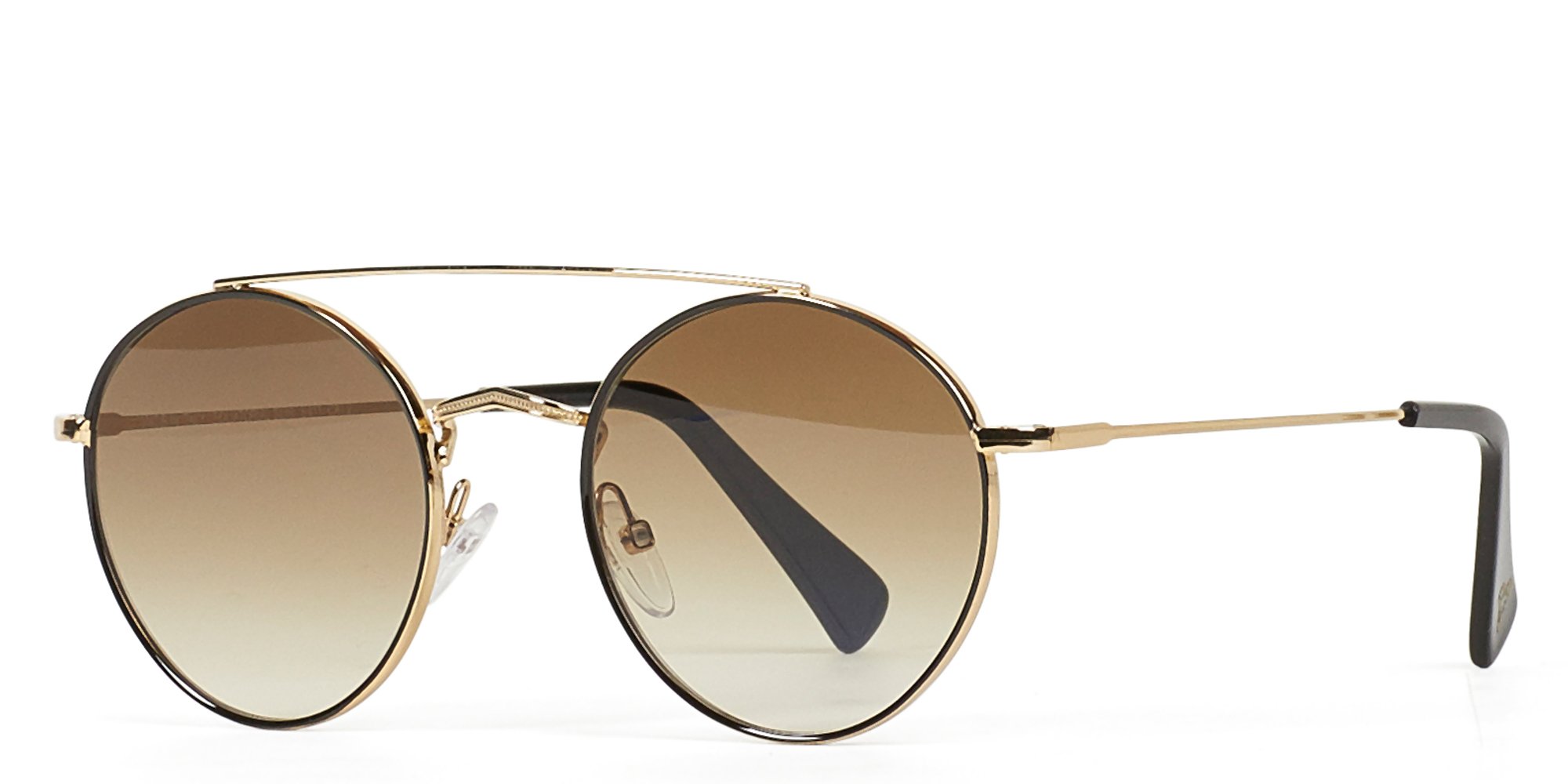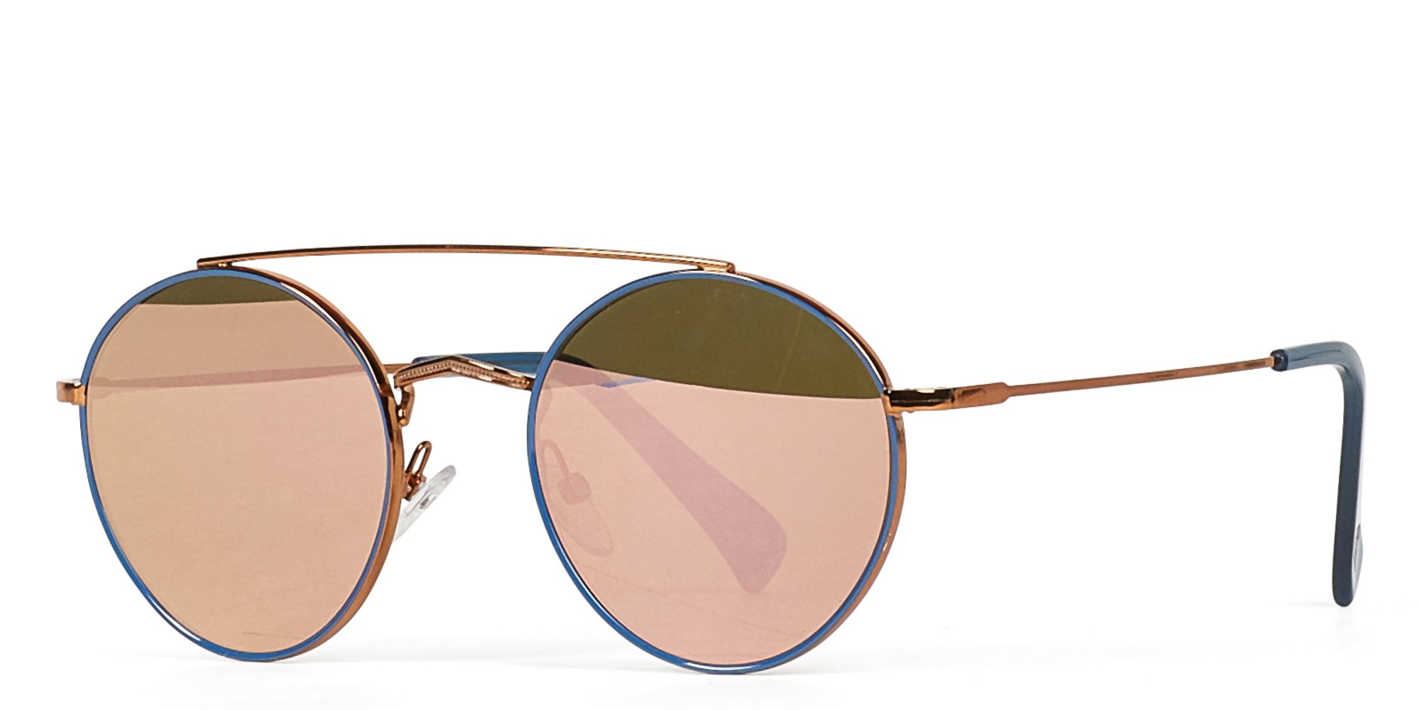 Made in Italy, Equatorial has a curvaceous feel with its round lenses and wide-brimmed top bar. This metal sunglass frame features a pop of color on the frame front and a uniquely patterned bridge.