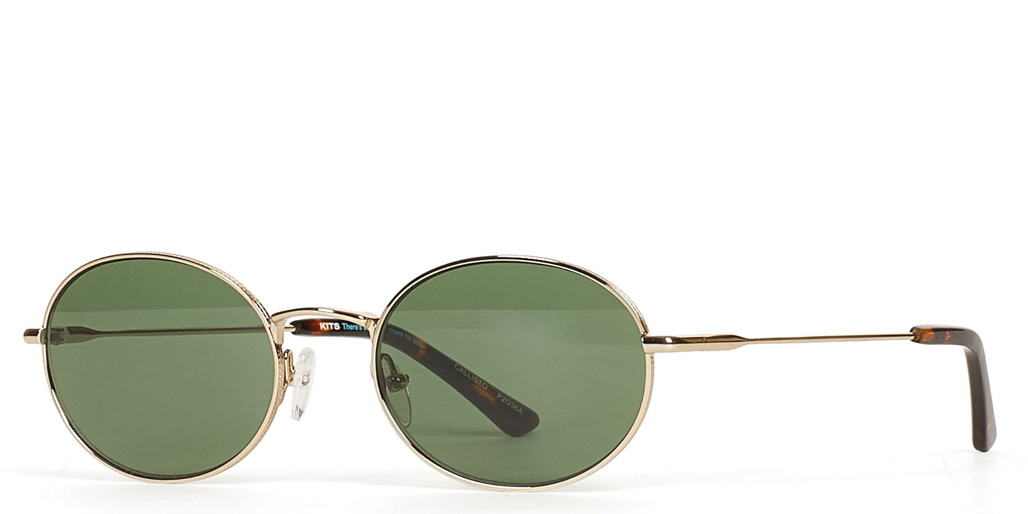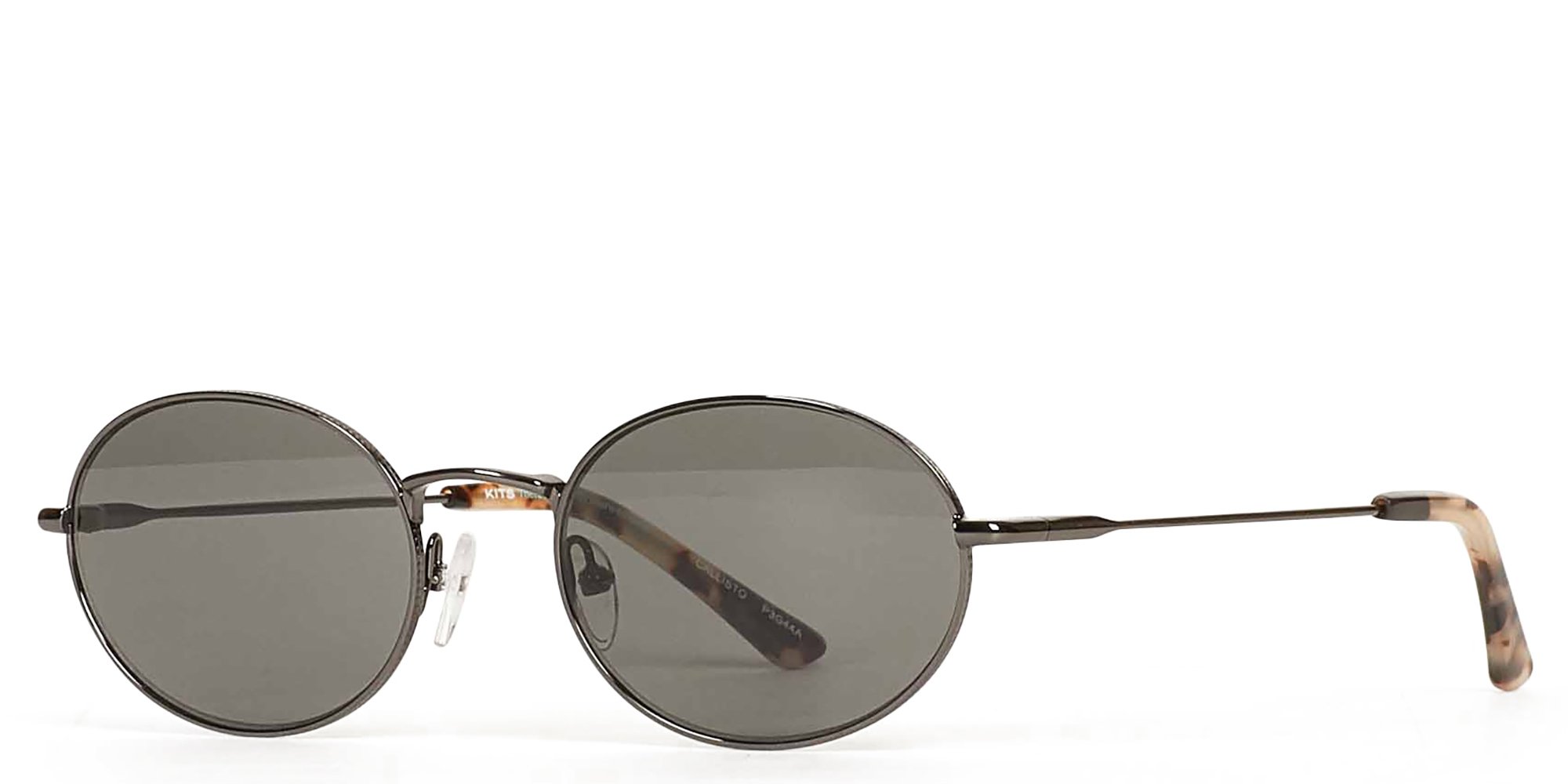 Inspired by the 90's, these oval Callisto sunglasses compliment many face shapes. They pair satin black metal with tortoise temple tips and greenish-grey G-15 sun lenses. A subtly embossed pattern adds texture around the eyerim and the nose pads can be adjusted.