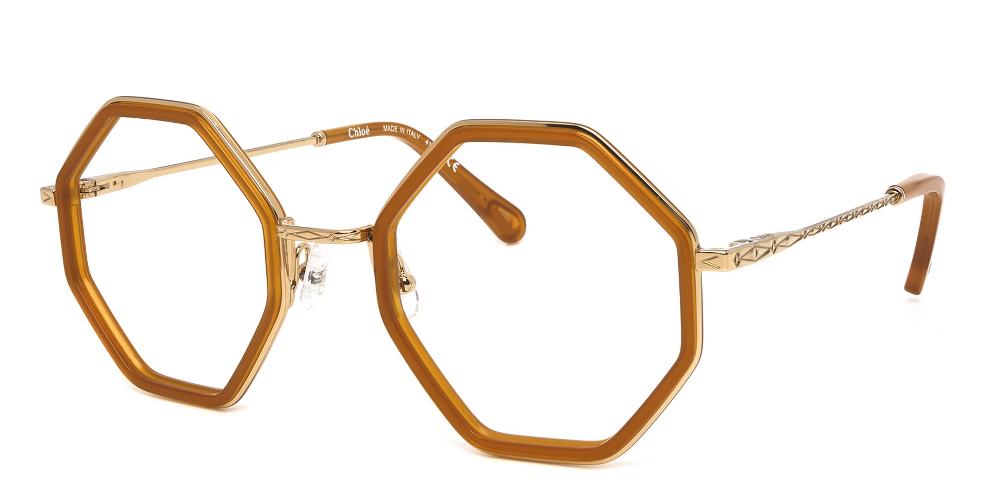 Indulge a flair for the dramatic with these Chloe CE2142 glasses. The hypoallergenic acetate and metal construction resists flex and corrosion, while keeping the glasses gentle on your skin. These ultra-thin frames with a single bridge are lightweight and sophisticated. Adjustable silicone nose pads and ergonomic temple ends enhance your comfort and ensure a good fit. These hexagonal frames add definition to a round or oval face.