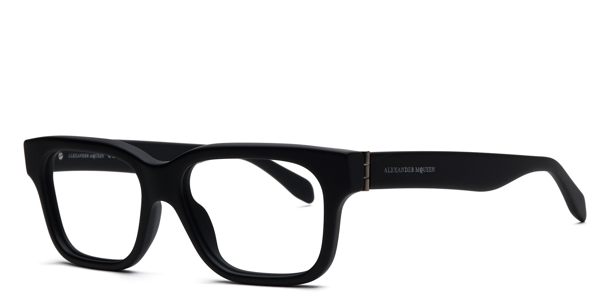 Alexander McQueen designs the AM00380 eyeglasses with the high fashion and elegant sophistication synonymous with this celebrated design house name. The full rim rectangular frames are made from lustrous, durable acetate with a sturdy saddle bridge for a retro vibe. The thick, bold temples feature the brand signature for a luxurious touch. Showcase your appreciation for Alexander McQueen's unmistakable designer style wearing these glamorous glasses.