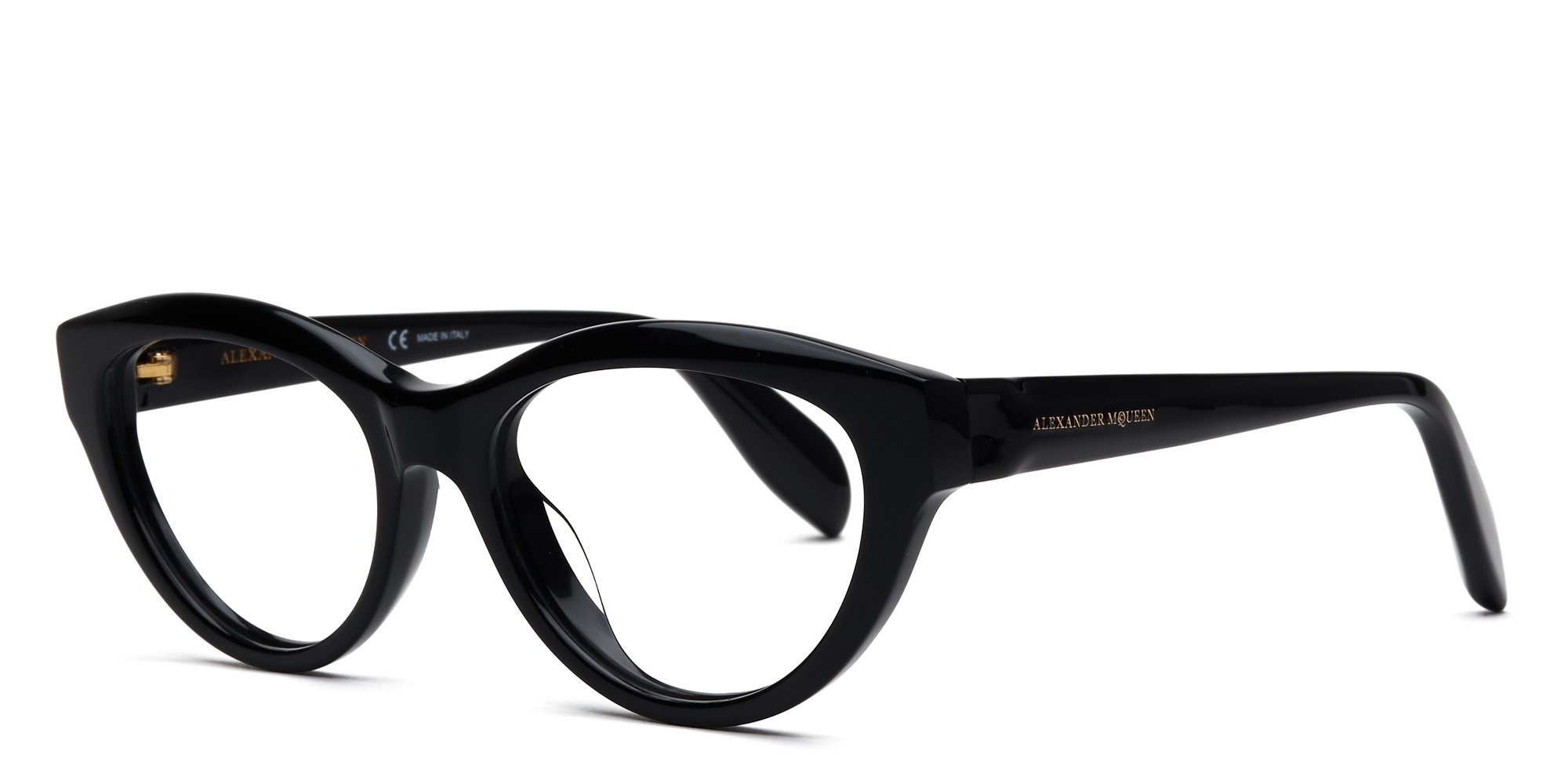 Alexander McQueen combines function and fashion in these bold AM00450 eyeglasses. Crafted from lightweight, lustrous acetate, the full rim frames are strong enough to take on your most demanding days, but theyre plenty comfortable for long hours of wear. A sturdy saddle bride and unique shape combine to make an eye catching statement, with the AM00450 logo at the temple end for added appeal. Take your style to the new heights when you reach for these distinctive cat eye eyeglasses from AM00450.