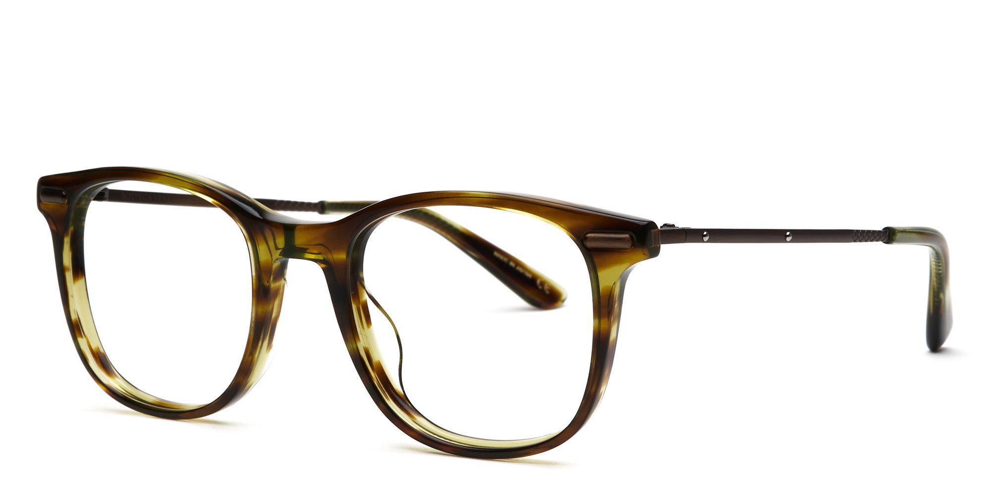 Bottega Veneta crafts these BV0033O eyeglasses for the fashion savvy wearer. The round rims are made in hypoallergenic acetate, a lightweight plant-based plastic engineered to endure the active agenda of todays wearer. Made in sturdy, corrosion resistant metal, the slim temples retain their shape through extended wear and feature plastic socks over the tips for comfort behind the ears. Adorned with rivetson the temple and diamond-shaped details on the endpoints, these glasses make a statement in timeless style.