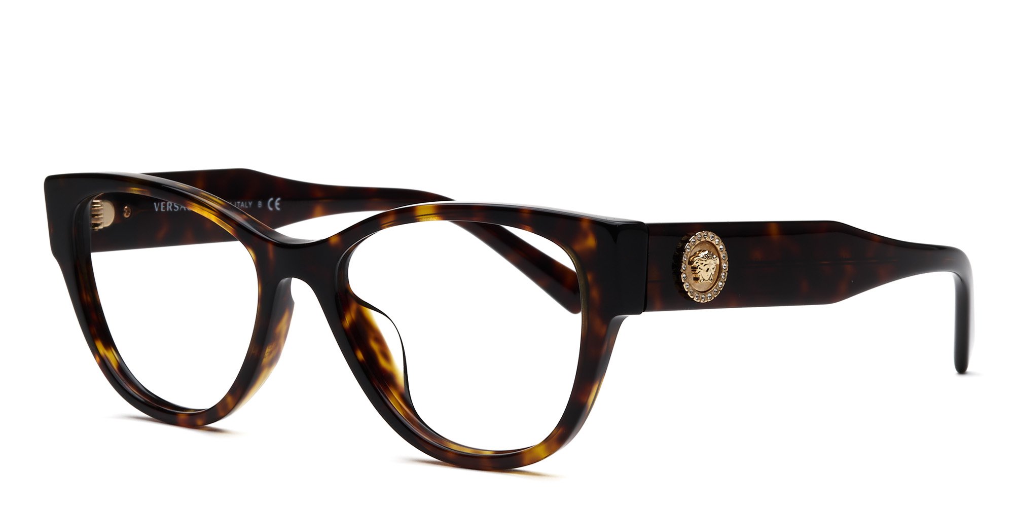 Reach for the OVE3281 Glasses and enjoy the edgy elegance you expect from Versace. These cat eye glasses offer all the vintage glamour of that classic silhouette, while the bold, thick temples are pure, unmistakable Versace. They feature the brands Medusa medallion for designer appeal, with eye catching crystal accents surrounding it to add flash. The acetate frames are beautifully lustrous, durable, and lightweight, resulting in good looking and comfortable designer glasses youll enjoy wearing for years.