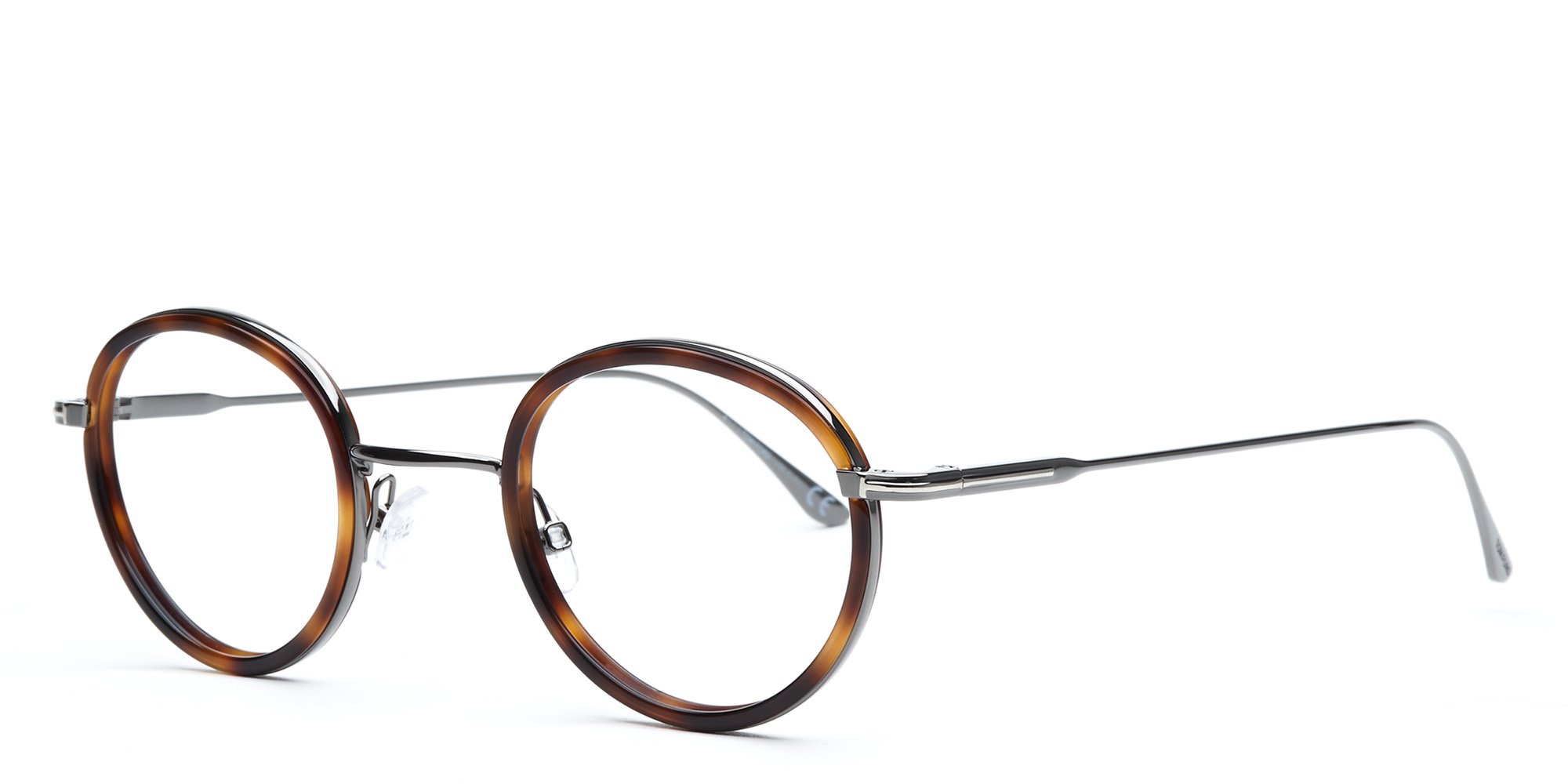 Tom Ford combines minimalist styling and vintage inspired design in these distinctive FT5521 eyeglasses. The full rim frame is made from a flexible, hypoallergenic acetate and metal thats durable enough to keep up with your busy lifestyle. Temple tips are molded for comfort. The round lenses and a single bridge lend a retro vibe, and the Tom Ford logo at the temple adds classic appeal. These glasses make a smart choice for the wearer who prefers clean lines and uncomplicated style.
