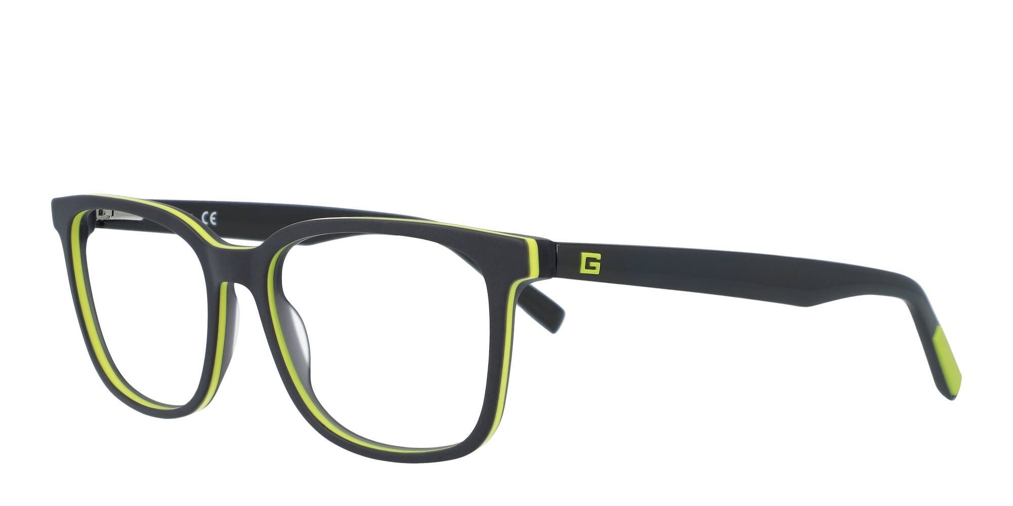 GUESS knows that fashion is important, and thats why modern style is built into these GU50034 eyeglasses. The full rim frames are strong and lightweight, and they feature a single saddle bridge for added stability. The flexible spring hinges are comfortable and secure. Shark fin temples boast the GUESS G logo for added appeal. Whether your tastes are vintage or classic, you'll shine with sophistication when you step out wearing these retro styled glasses by GUESS.