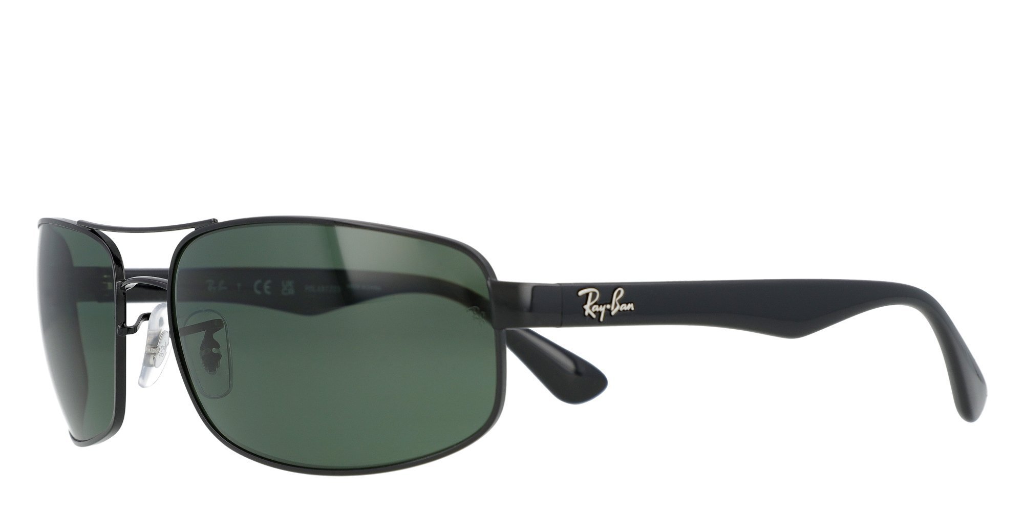 Enjoy road trips or picnics under the bright sun with Ray-Ban RB3445 sunglasses. These durable, metal frame shades protect your eyes, while rubber inserts at the temple tips ensure your eyewear stay securely in place. The distinctive aviator style double bridge and broad temples add a touch of class to your sunny day wardrobe. Elbow wrapped plates on these unique, shield shaped sunglasses hide the hinges to give you a neat, smooth look, while adjustable nosepads ensure a comfortable fit. Ideal for people with diamond shaped or round faces.