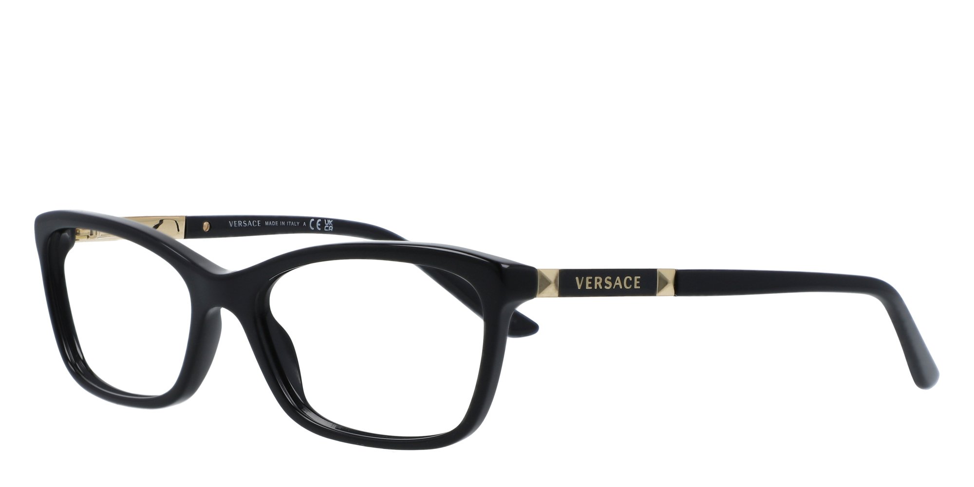 The subtle shape of these Versace VE3186 eyeglasses makes them an expressive departure from traditional rectangular frames. The glasses inspire impressions of prestige and luxury, with two embellished studs as bookends to the Versace name on the slender temples. Made of hypoallergenic, plant based acetate, the VE3186 model full rim frames boast strength and flexibility, and the softly curved silhouette complements square and heart shaped faces. The spring hinges support a wider range of motion for additional resilience and ease of wear.