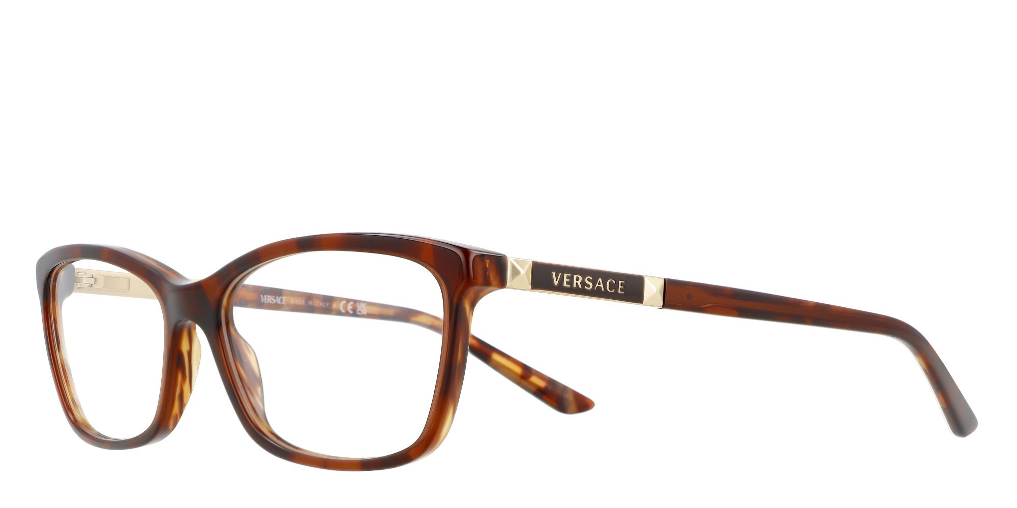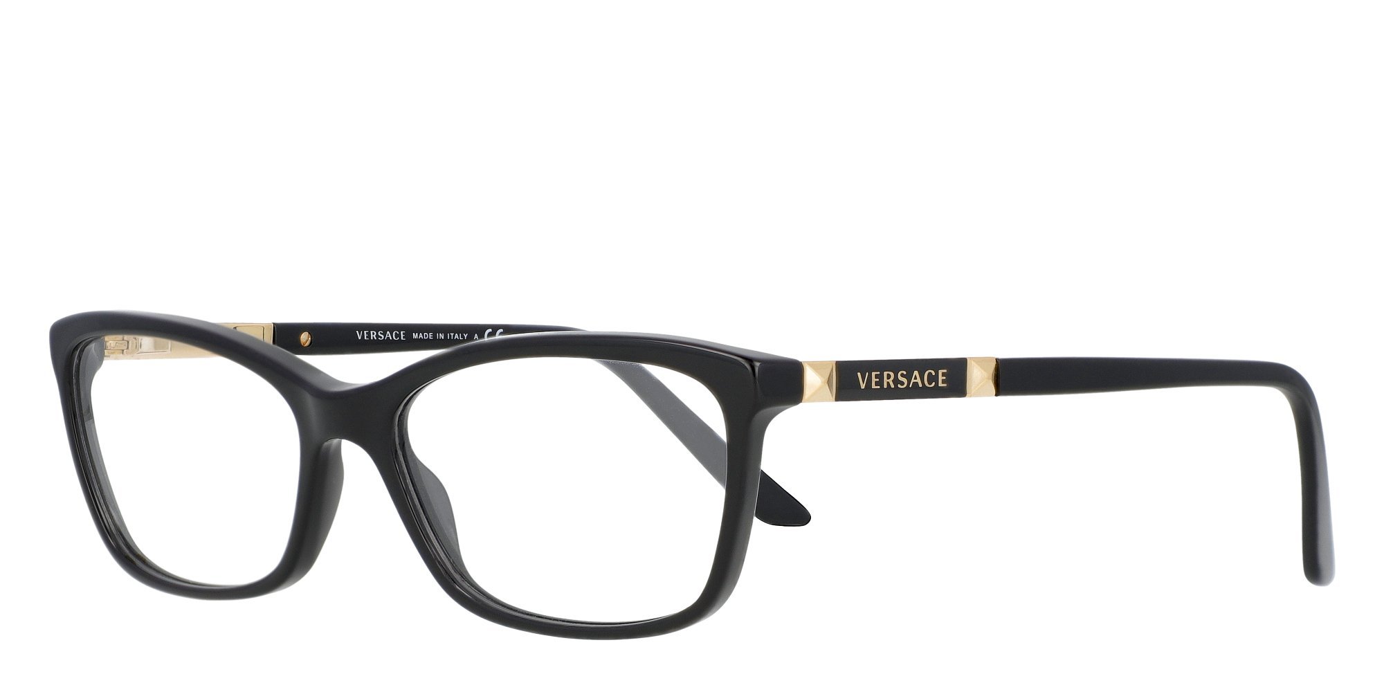 The subtle shape of these Versace VE3186 eyeglasses makes them an expressive departure from traditional rectangular frames. The glasses inspire impressions of prestige and luxury, with two embellished studs as bookends to the Versace name on the slender temples. Made of hypoallergenic, plant based acetate, the VE3186 model full rim frames boast strength and flexibility, and the softly curved silhouette complements square and heart shaped faces. The spring hinges support a wider range of motion for additional resilience and ease of wear.