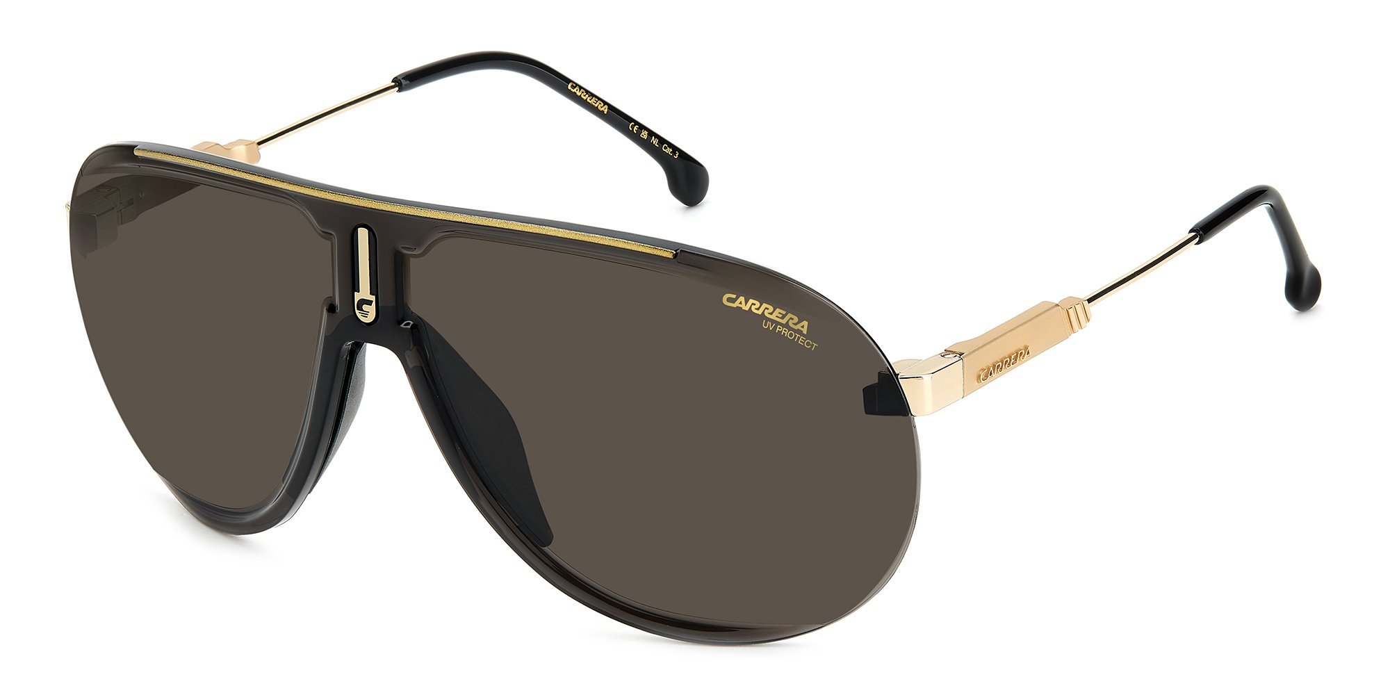 The Superchampion Carrera sunglasses are unparalleled in their uniqueness, embodying the seamless fusion of exquisite design and cutting-edge technology. These sunglasses are completely rimless, featuring a single lens that boasts intricate embossed and debossed details, adorned with the iconic Carrera 'C'.