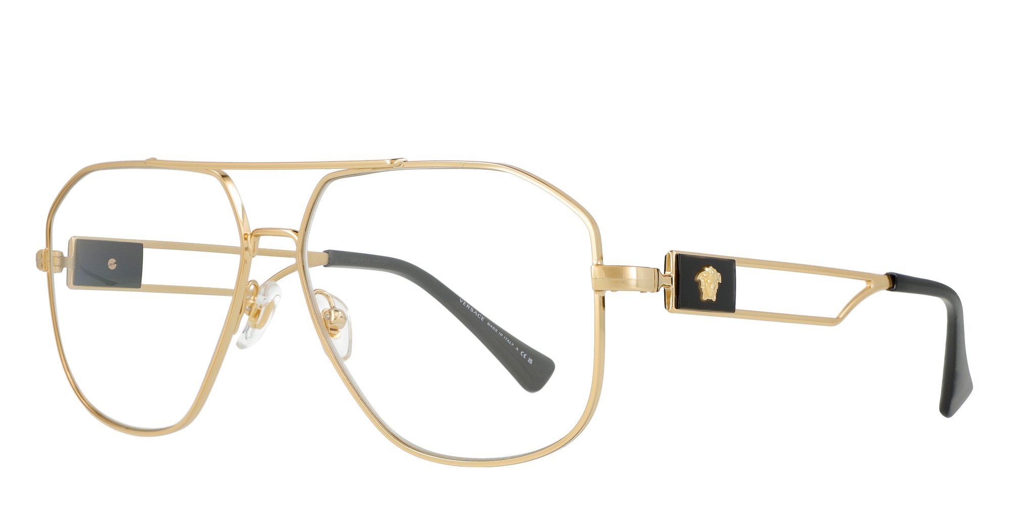 The men's Versace VE1287 eyeglasses embody the unmistakable style of the designer, characterized by boldness and an edgy flair. Crafted in durable and corrosion-resistant metal, these aviator-style frames exude both strength and fashion. The slender temples gently curve inward, ensuring a secure fit that stays in place during your active day. To add a couture touch to these attractive aviator glasses, Versace adorns them with an engraved medallion at the brow end.