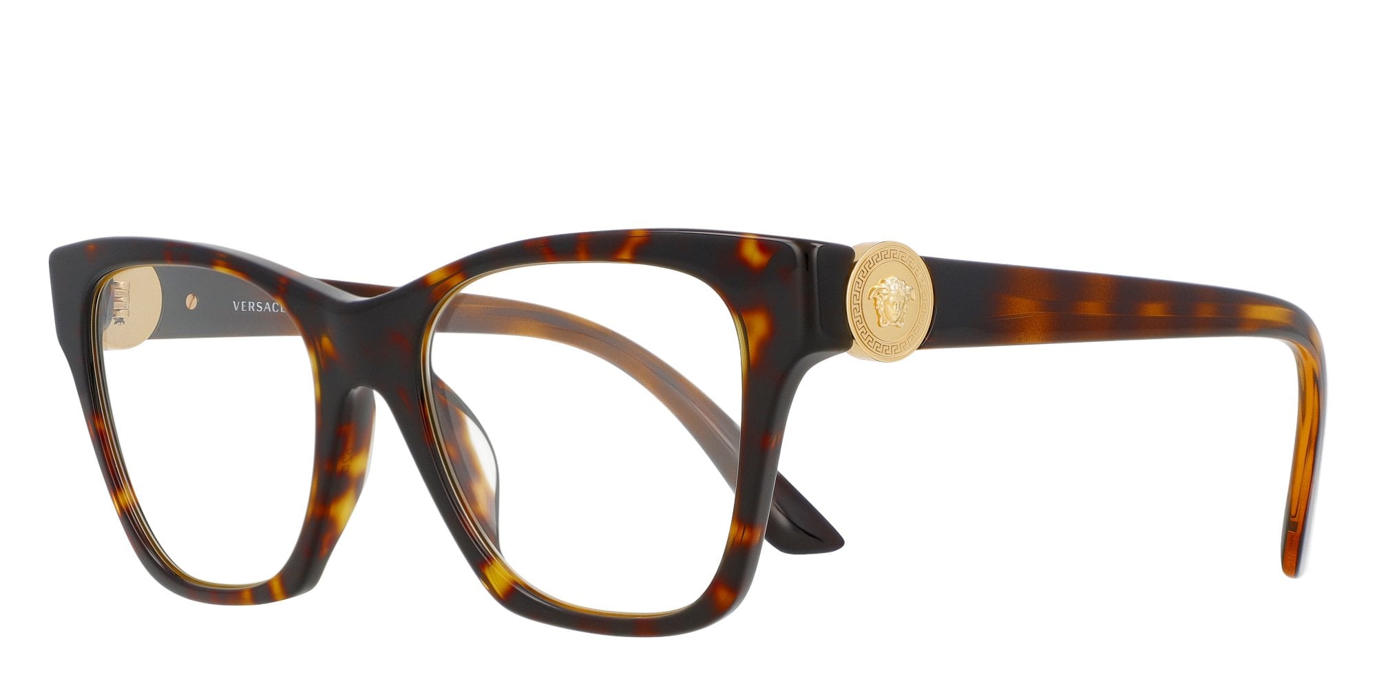 Embodying an urban vibe, the women's Versace VE3287 eyeglasses make a bold statement. Crafted with cat-eye frames from lightweight and lustrous plastic, these glasses offer both durability and style, standing up to heavy wear effortlessly. The slim temples gently curve inward, widening at the tips to ensure stability behind the ears. Adding a touch of chic appeal, a metallic Medusa head graces the brow end. Display your sophisticated side as you don these eye-catching Versace glasses, expressing your unique sense of fashion with every glance.