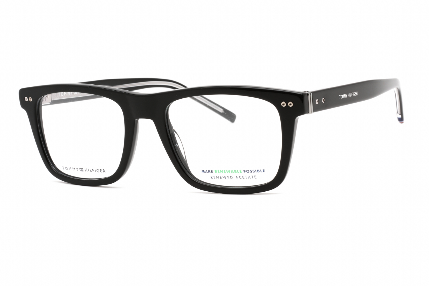 Contribute to saving the planet with these men's eyeglasses from the Tommy Hilfiger TH 1892 collection. Crafted with recycled acetate frames, these glasses offer sustainable accessories at a competitive price point. Inimitable with their contemporary design, featuring square shapes and on-trend transparent hues, these eyeglasses are adorned with metal rivets on the front and the Tommy Hilfiger logo on the end tips, ensuring they're unmistakable.