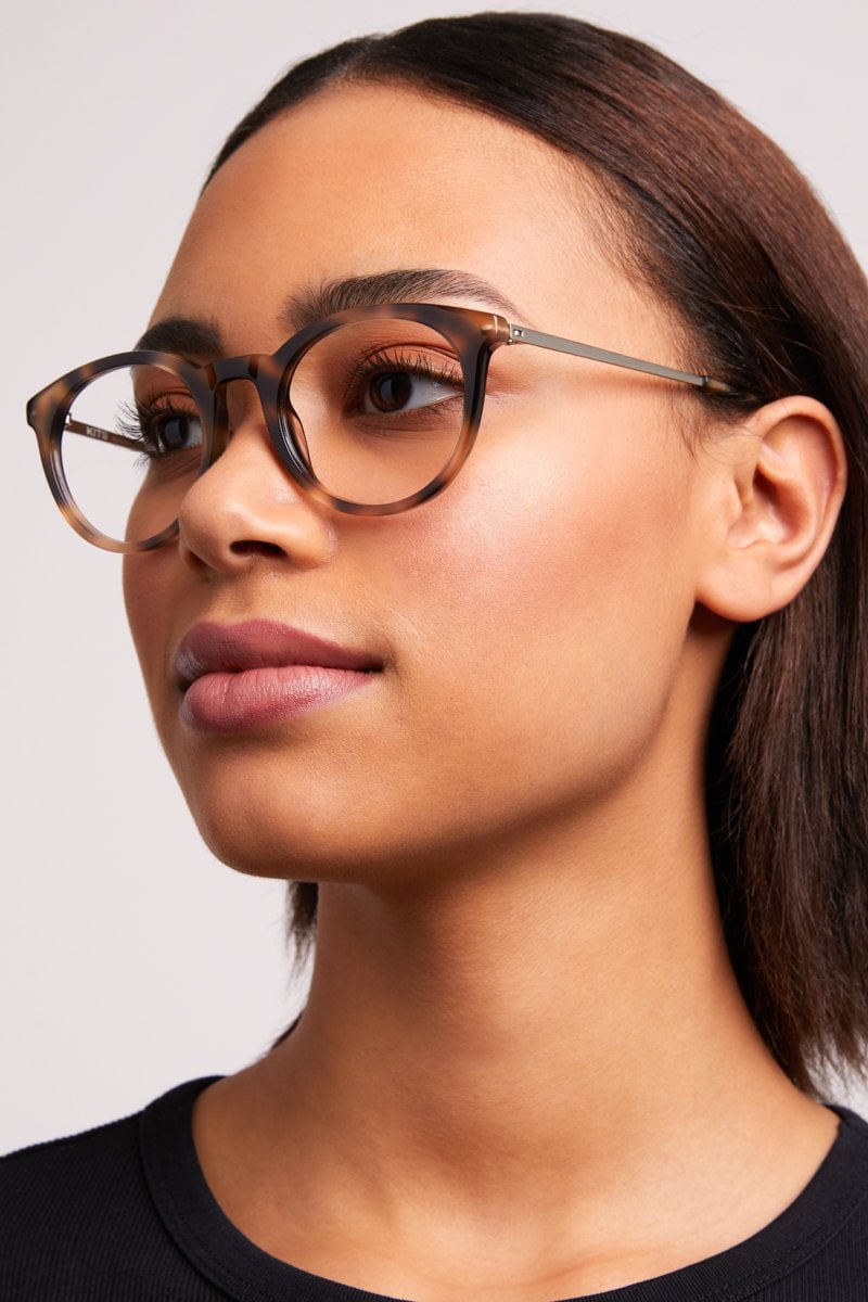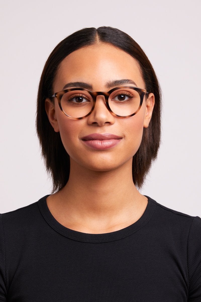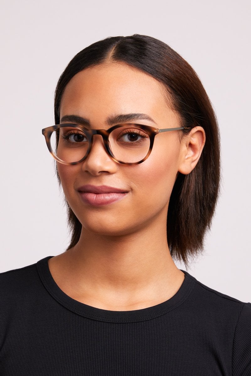 Everyday glasses with textured acetate fronts and lightweight metal temples.