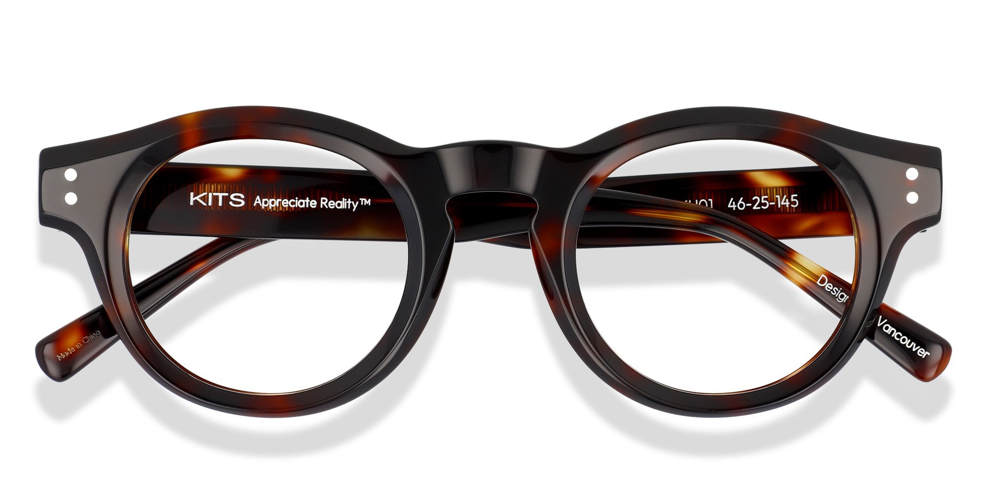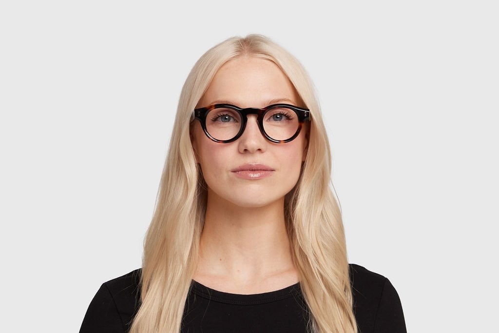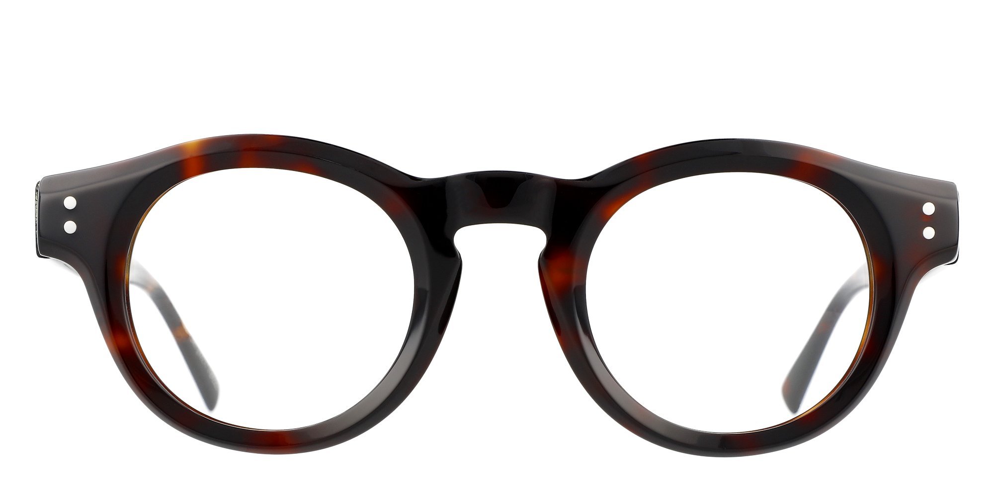 Retro-inspired round acetate frame with bevel details and exposed rivet accents.