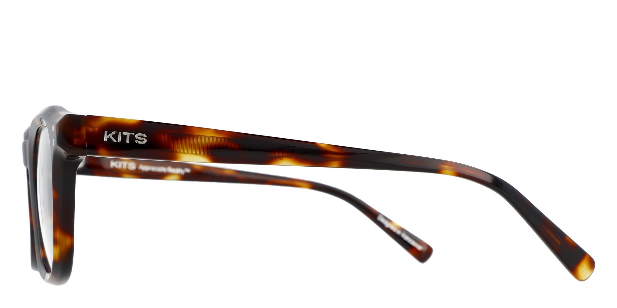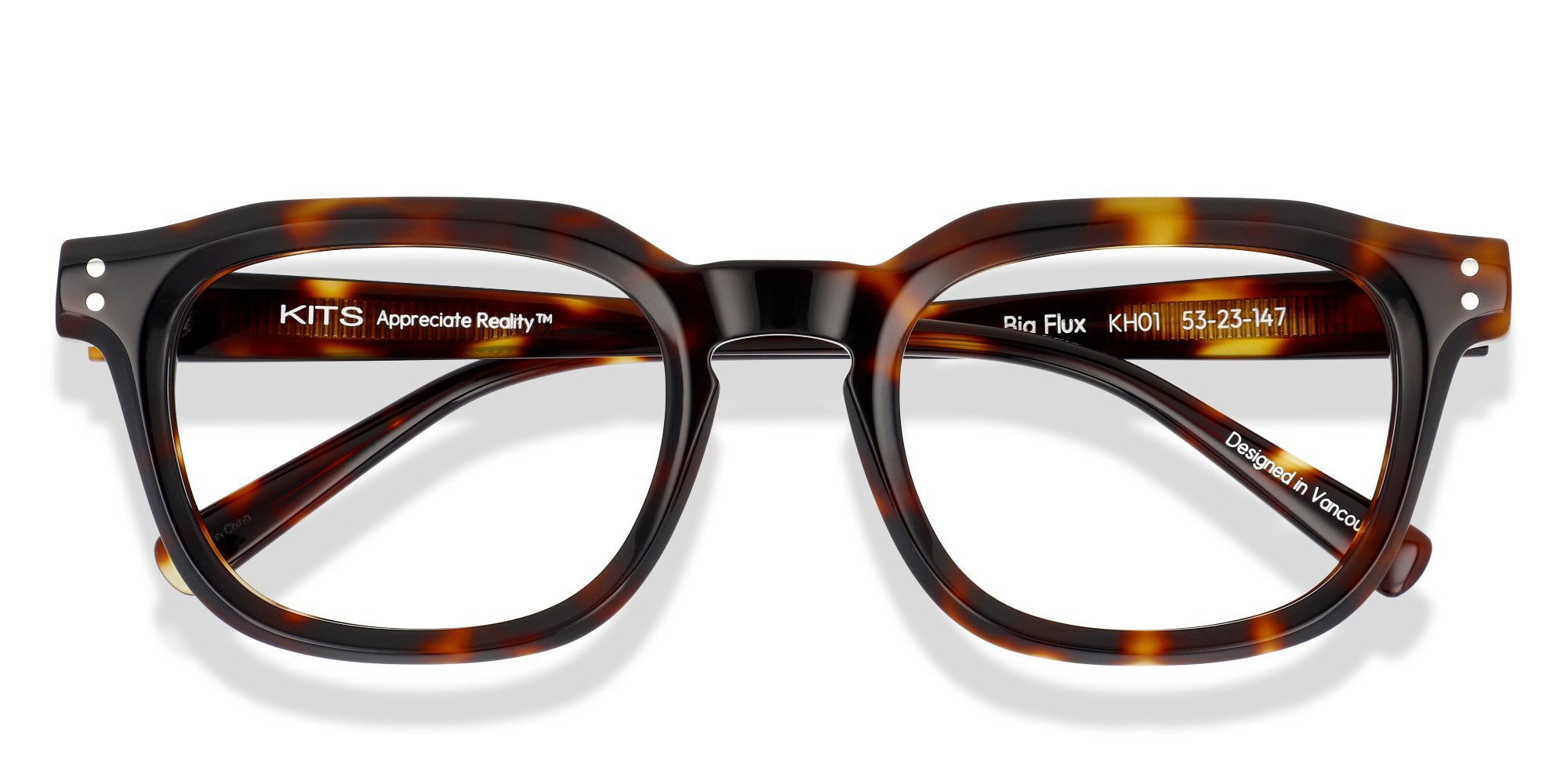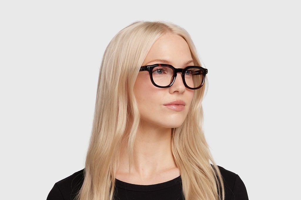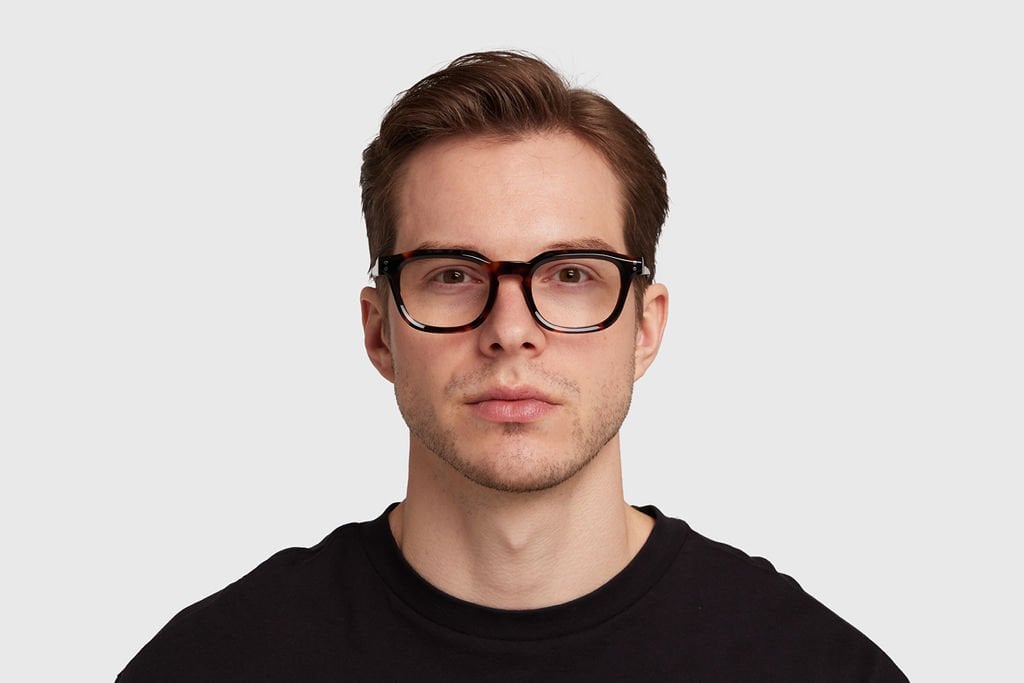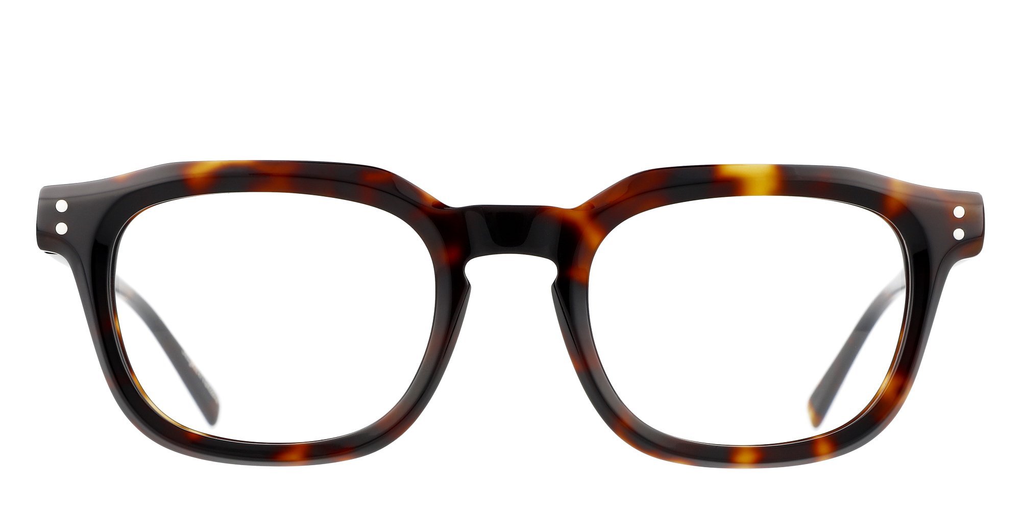 Retro-inspired square acetate frame with bevel details and exposed rivet accents.