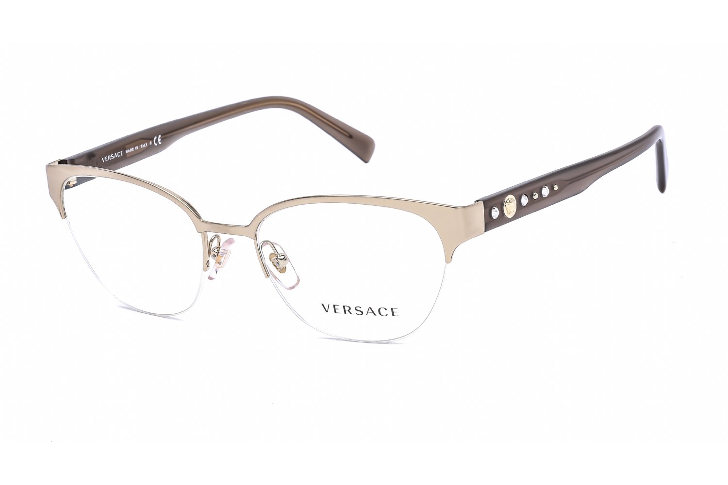 Versace VE1255B in Pale Gold. This model features an eye catching shape to complement your facial features.The frame is made from quality materials, balancing weight and strength for your ultimate comfort.
