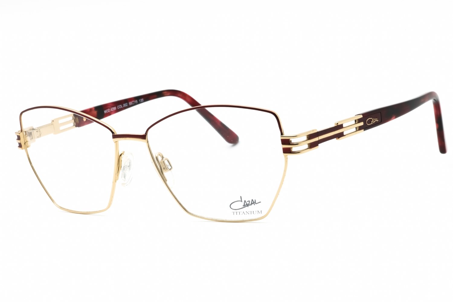 Cazal 4299 in Bordeaux-Gold. This model features an eye catching shape to complement your facial features.The frame is made from quality materials, balancing weight and strength for your ultimate comfort.