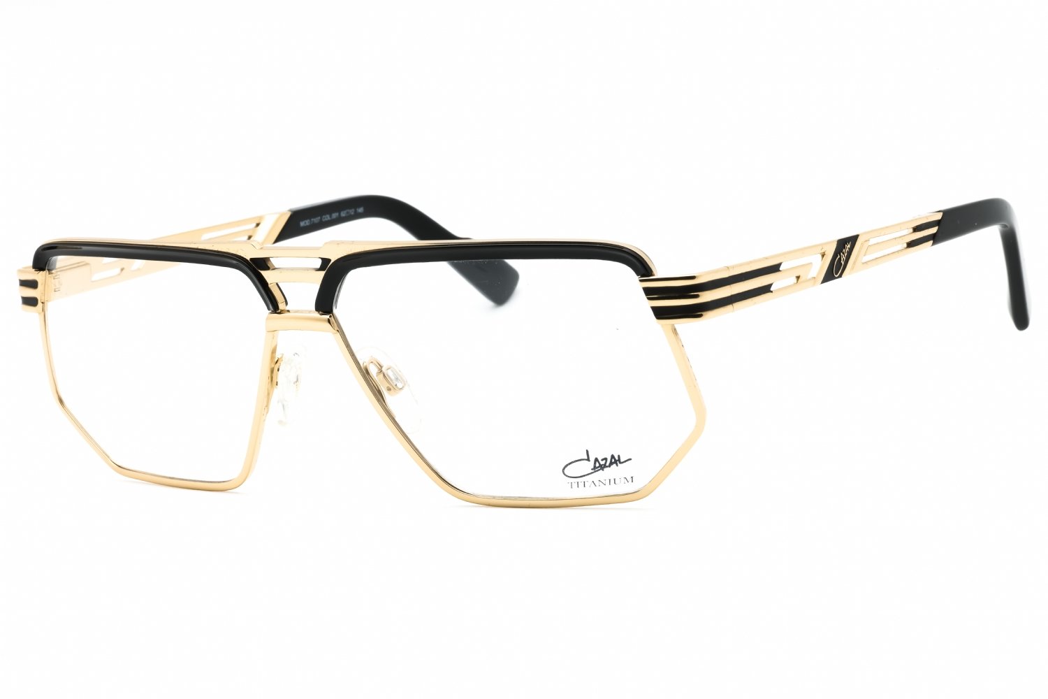 Cazal 7107 in Black-Gold. This model features an eye catching shape to complement your facial features.The frame is made from quality materials, balancing weight and strength for your ultimate comfort.