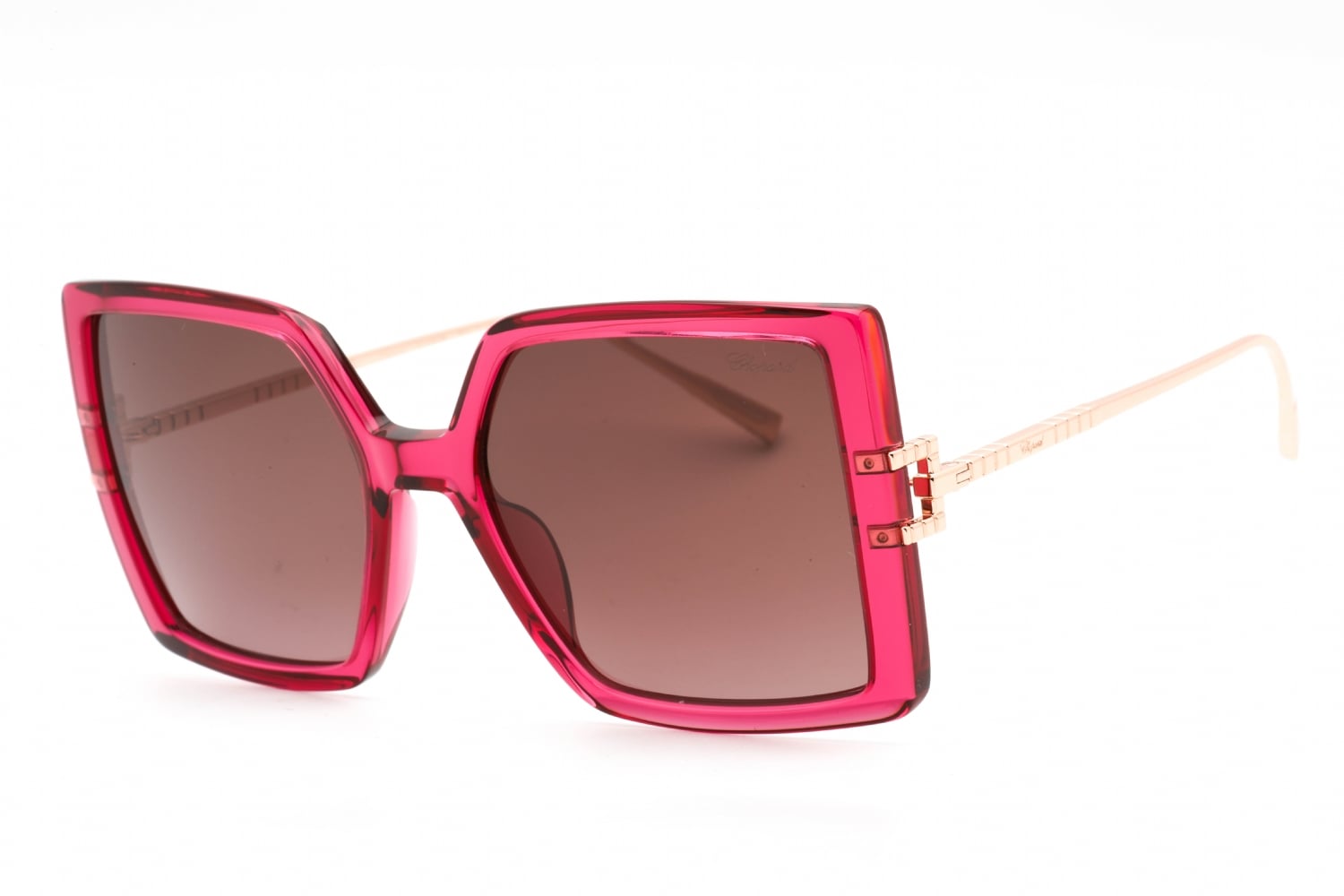 Chopard SCH334M in Transparent Raspberry Pink. This model features an eye catching shape to complement your facial features.The frame is made from quality materials, balancing weight and strength for your ultimate comfort.