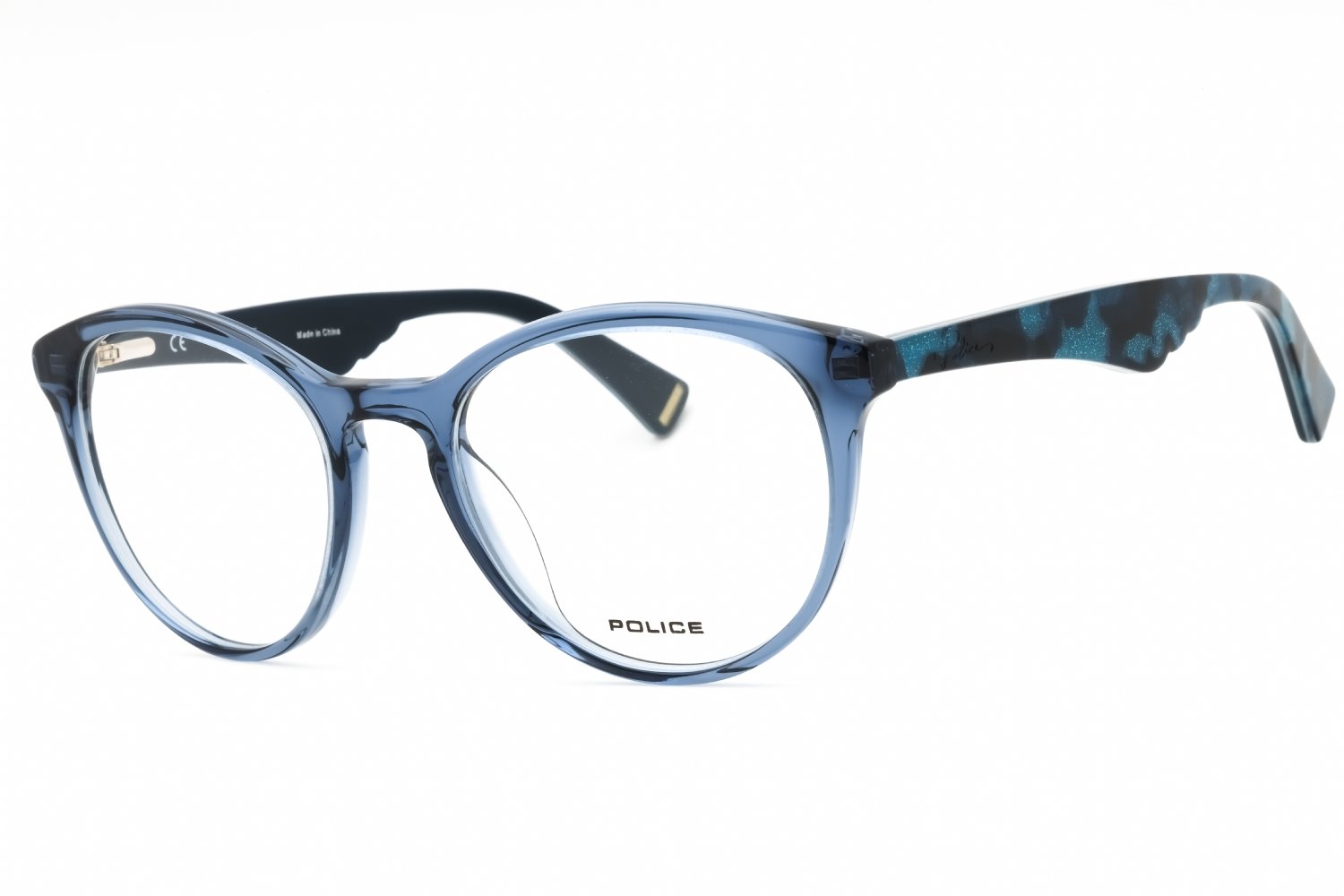 Police VPL764 in Shiny Transparent Blue. This model features an eye catching shape to complement your facial features.The frame is made from quality materials, balancing weight and strength for your ultimate comfort.