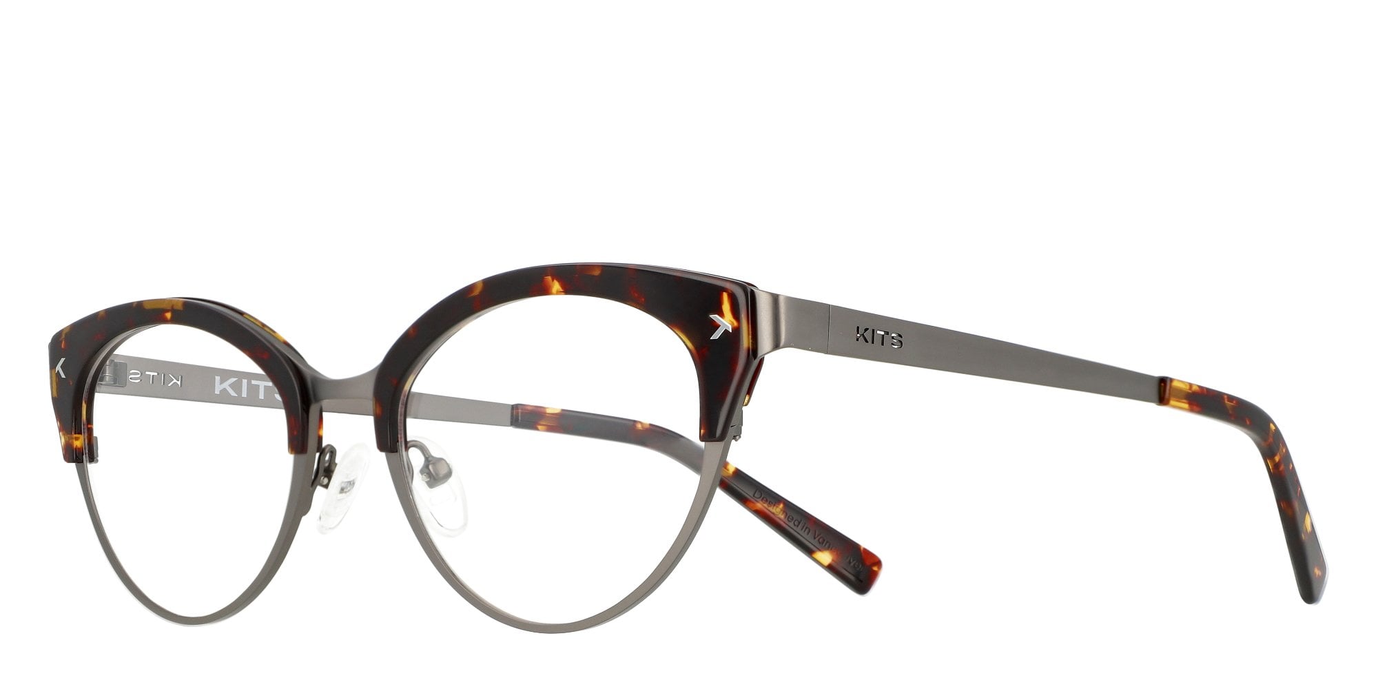 Cat eye hybrid glasses with stainless steel frame and acetate brow pieces.