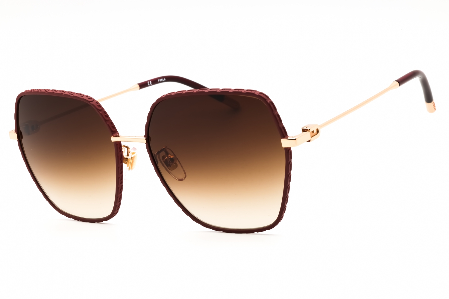 Furla SFU628 in Shiny Copper Gold With Coloured Parts. This model features an eye catching shape to complement your facial features.The frame is made from quality materials, balancing weight and strength for your ultimate comfort.